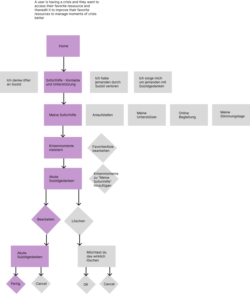 Based on the feedback that I created, I decided to create a comprehensive customer journey map. This holistic approach allowed me to consider every aspect of the design and functionality of the app. My volunteer experience with TelefonSeelsorge provided valuable insights into effectively „marketing“ the app and understanding the needs and characteristics of our target audience.
